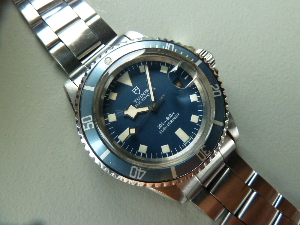 1975 Submariner 9411/0 in fantastic original condition, perfect matching original SnowFlake SWISS dial and hands with creamy patina, exceptional beveled case, authentic faded insert with tritium pearl, excellent Tudor oyster folded bracelet.